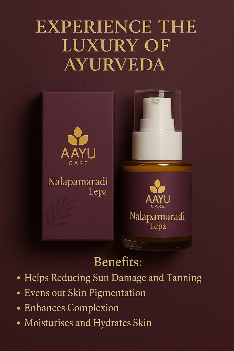 Nalpamradi lepa is the traditional ayurvedic nalpamaradi oil or thailam in an easy-to-use lepa format. With prolonged exposure to the sun, the skin gets damaged, becomes dull and develops dark spots. This lepa has Nalpamaradi properties, which help brighten the skin tone, improve the complexion and remove the tan effect. In addition, it hydrates and nourishes your skin, keeping it soft and supple. When applied over a wasp or mosquito bite, this balm reduces the toxin's spread and provides a soothing effect. This wash-off product can be removed with lukewarm water or a mild cleanser, or you may choose to leave it on.